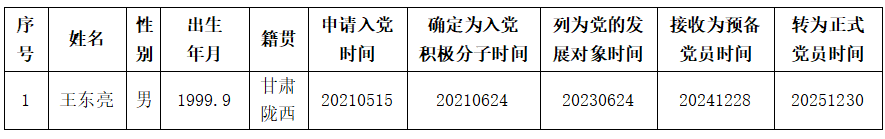 委员会发展党员工作实施细则》的规定,经本人申请、党支部征求意见、支部委员会审查、学院党委审查和党支部大会讨论决议,决定王东亮同志转为正式党员。现将有关情况公示如下:
