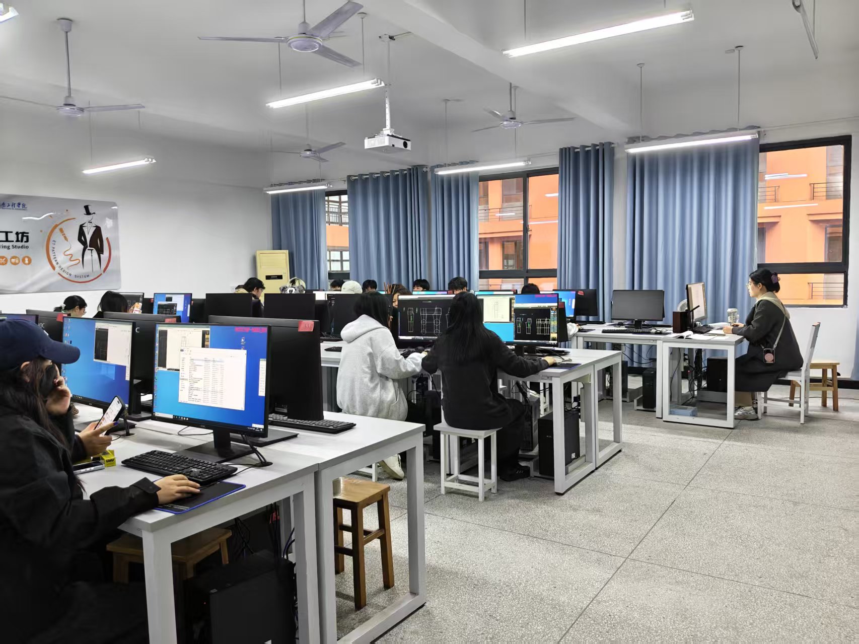 课堂上,古皎霞老师先带领学生回顾裤子推板重点知识,再从裙原型结构要点切入,清晰讲解推板基准、档差计算、点位放缩等关键内容,同步演示服装CAD 软件操作,将理论讲解与上机实操有机结合。整堂课环节紧凑、重难点突出,同时自然融入课程思政元素。