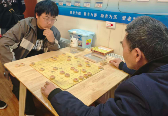 在台下,志愿者与爷爷展开“楚河汉界”对决,当爷爷走出一步好棋,脸上露出不易察觉的笑意,眼神里满是成就感;偶尔被志愿者“将一军”,他便眯起眼睛重新思索,笑语漾棋间;有的志愿者们围坐老人身边,耐心倾听他们的过往故事,暖心交流生活近况,还俏皮地比出剪刀手、歪头笑等可爱姿势合影,老人们布满皱纹的脸上带着孩童般的欣喜。