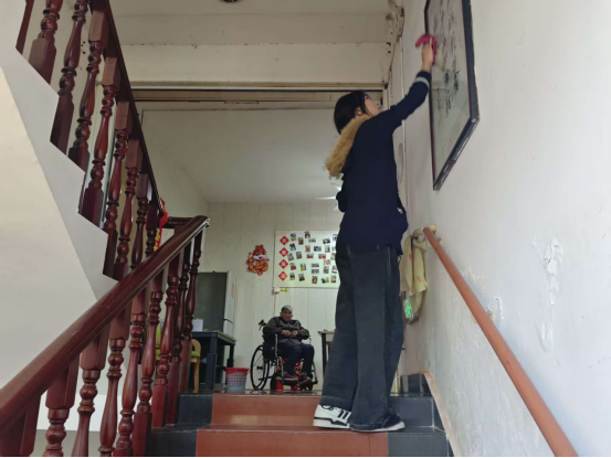 除文娱活动外,志愿者们分工协作对公寓进行了深度清洁。拖地、擦桌、擦楼梯扶手,清理卫生死角,对公共区域进行全面消毒。经过一个多小时的劳动,公寓环境焕然一新。地板拖得干净光亮,扶手擦得顺滑无尘。敬老院的阿姨笑着对志愿者说,“以前扶手有点灰,摸着手感不舒服,现在干干净净的,上下楼都踏实!我们这老人住着也舒心!”