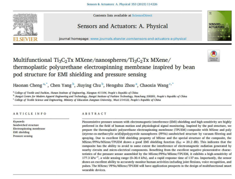 近日,纺织工程教研室程浩南老师在多功能纳米纺织材料研究领域取得新进展,研究成果以“Multifunctional Ti3C2Tx MXene/nanospheres/Ti3C2Tx MXene/ thermoplastic polyurethane electrospinning membrane inspired by bean pod structure for EMI shielding and pressure sensing”为题发表在国际期刊《Sensors and Actuators: A. Physical》上(DOI: 10.1016/j.sna.2023.114226),该期刊为SCI收录期刊(2022年影响因子4.291),是Elsevier旗下一本专注于传感器前沿研究的期刊。程浩南老师为该论文第一作者和共同通讯作者,成人网站
