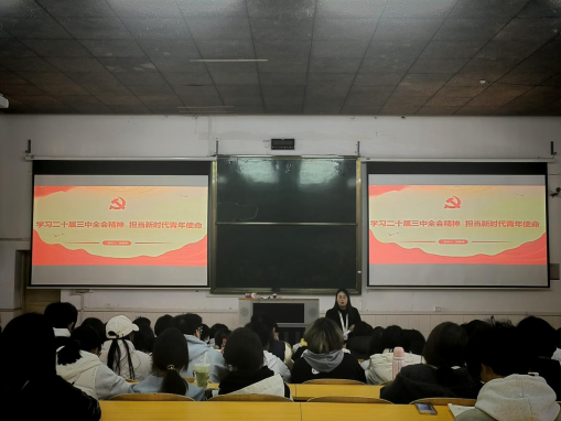 团总支书记傅静琳在电教楼105室为全院各班团支书讲授以“深入学习二十届三中全会精神,青年学子勇担新时代使命”为主题的团课。
