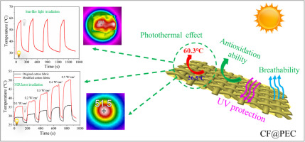 论文围绕天然-纳米双酶协同催化表儿茶素聚合整理棉织物,赋予棉织物光热、抗紫外线和抗氧化特性,在模拟太阳光和近红外激光照射下,改性棉织物均呈现较好的光热特性及稳定性,经过20次家庭水洗后,改性棉织物依旧具有优异的抗紫外线特性,该研究成果有望应用于室温下热疗与低温环境中保护人体。相较于传统催化剂,采用天然-纳米双酶协同催化聚合具有一定的先进性。