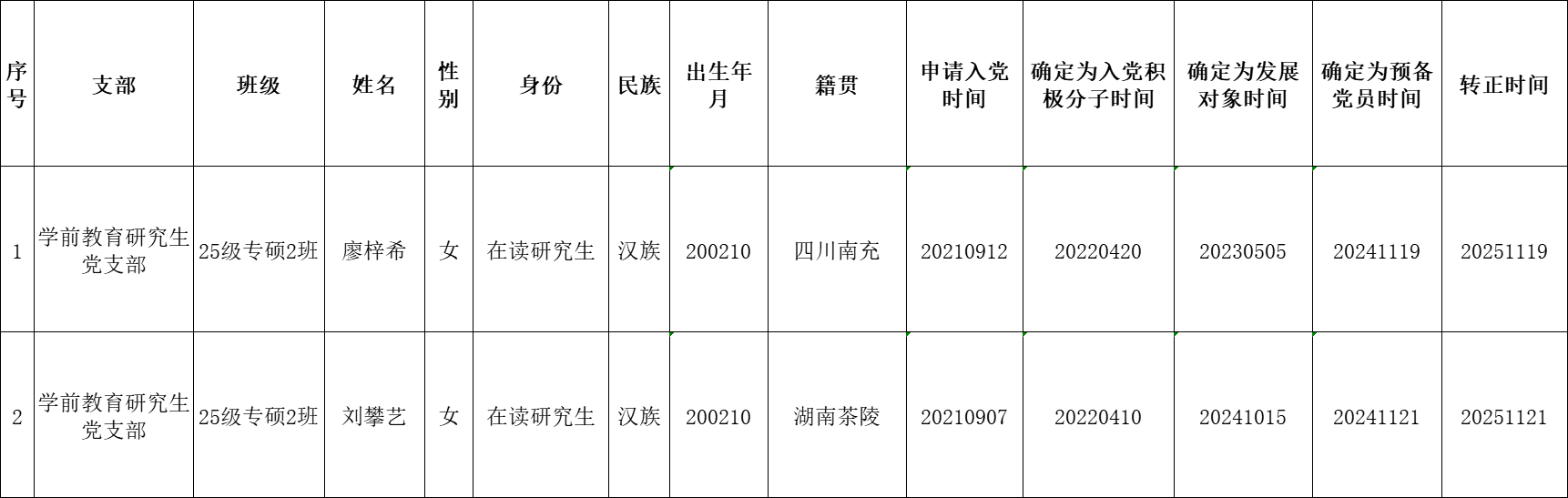 根据《中国共产党发展党员工作细则》中发展党员的文件要求,经对廖梓希等2名同志的预备党员转正条件、转正程序等进行严格审查。20251125日,学院党委会集体审议讨论了廖梓希等2名同志的转正问题。党委委员共7名,实到会6,1名委员因公务冲突请假。经逐个审议和表决,实到会的6名党委委员一致认为廖梓希等2名同志已具备正式党员条件,同意批准按期转为中共正式党员,党龄从预备期满转为正式党员算起。具体名单公布如下: