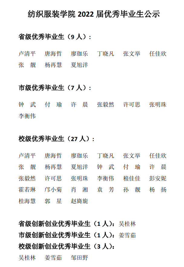 根据学校《关于评选2022届省、市、校级优秀毕业生和创新创业优秀毕业生的通知》的要求和学校优秀毕业生评定办法,经本人申请、班级推荐、班主任审核、学院民主评议,初步评定了成人网站 2022届优秀毕业生,现将推荐名单公示如下: