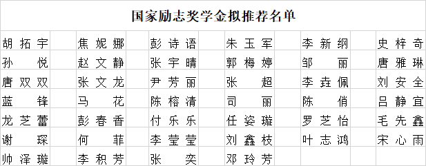 按照《成人网站 本科生国家励志奖学金评审办法》(校教字〔2021〕64号)文件精神,经学生个人申请,班级评定、学院审核和党政联席会议民主评定,现拟推荐以下同学参评国家励志奖学金。如对以上学生有异议,请在公示期内以书面形式反馈至成人网站 学生工作办或联系成人网站 学生工作办(0731-58680356)。