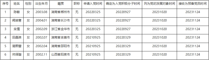 学生第二支部委员会接收陈靓银、陈敏等10名同志拟转正为中共正式党员,现予公示,征求党员、群众和单位的意见。公示期限内,个人和单位均可通过来信、来电、来访等形式,向党支部、学院基层党委或校党委组织部举报反映公示对象在德、能、勤、绩、廉等方面的情况和问题。以个人名义举报反映的应署本人真实姓名和联系方式;以单位名义举报反映的应加盖单位印章。举报反映公示对象的情况和问题必须真实准确,内容尽量具体详细,并尽可能提供有关调查线索。受理单位对举报反映人的情况严格保密。