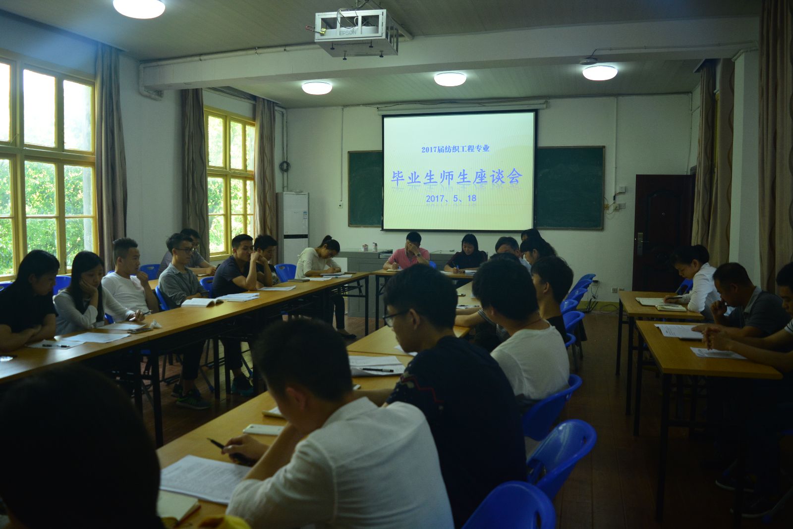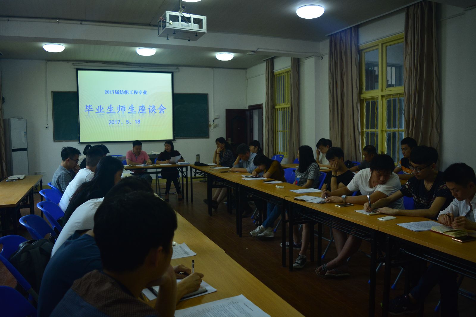 在电教303室召开2017届纺织工程专业毕业生座谈会,学院党总支书记江灏、副院长周衡书、副院长陈晓玲和副书记黄自力都出席会议,纺织工程专业20名毕业生代表和纺织工程专业教研室主任及骨干教师参加了会议。会议由周衡书主持。