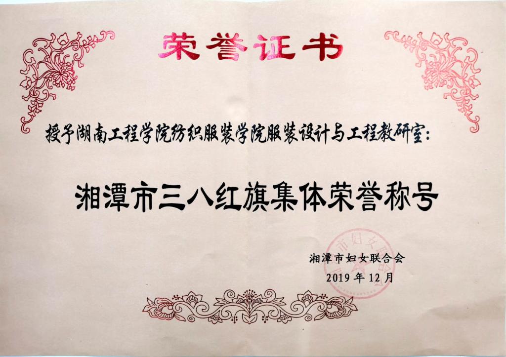 湘潭市妇联为激励先进,选树榜样,进一步引导和激励广大妇女在第一线建功立业,在社会生活和家庭生活中发挥独特作用,开展了选树“三八红旗手”和“三八红旗集体”的决定。成人网站 服装设计与工程教研室积极申报,在教学第一线积极开展各项工作并取得了良好的成绩,获得了湘潭市三八红旗集体荣誉称号。
