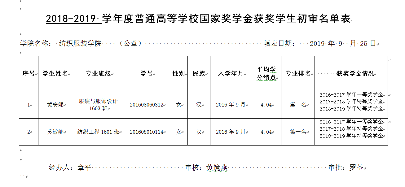 经过学生个人申请,班级和班主任推荐,学院选拔、审核和民主评定,现拟定推荐服装与服饰设计1603班黄安妮、纺织工程1601班莫敏娜参评2018-2019学年成人网站 国家奖学金。如对以上学生有异议,请联系成人网站 学生工作办(0731-58680356)或学院党总支副书记罗荃(18390215152)。