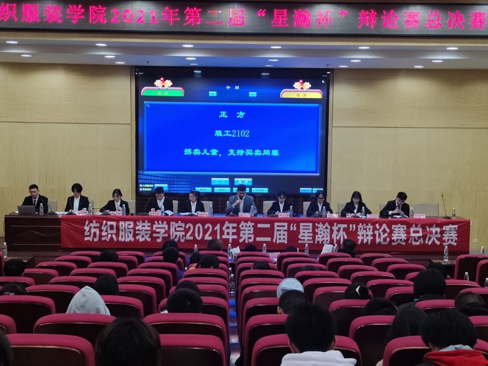 2021年第二届“星瀚杯”辩论赛总决赛在图书馆二报告厅拉开帷幕。本次比赛的两支队伍经历了12场比赛的选拔,正方为服装设计与工程2102班,反方为服装设计与工程2101班,两队围绕着“拐卖儿童,是否支持买卖同罪”这一辩题展开了精彩的辩论。