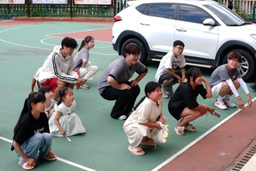 为培养孩童对体育运动的兴趣,鼓励孩童积极参与体育运动,促进体质锻炼和身心健康全面发展,实践团队走进孩童们的内心,开展了一次别出心裁的体育趣味运动会。实践团将红色体育融入到趣味运动会中,增设“穿越火线”拓展项目,每位志愿者随机匹配一名孩童组队,听从裁判口令,完成各项指令。游戏中每个小组时而起立时而蹲地时而匍匐前行,通过队友相互配合“掩护”,躲过“枪林弹雨”一起穿越“敌区”的包围,孩子们在运动中培养了团结协作意识和竞争意识,增强了身体素质,有助于他们的身心发展和社交发展。