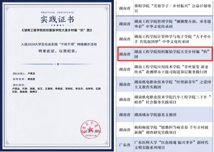 近日,由中国青年报社主办的2024大学生社会实践成果“千校千项”网络展示活动获奖名单公布,我院暑期“三下乡”团队——“东方红”乡村振兴促进团荣获团队优秀项目,服装与服饰设计2201班许婷牵头制作的作品荣获优秀作品奖。