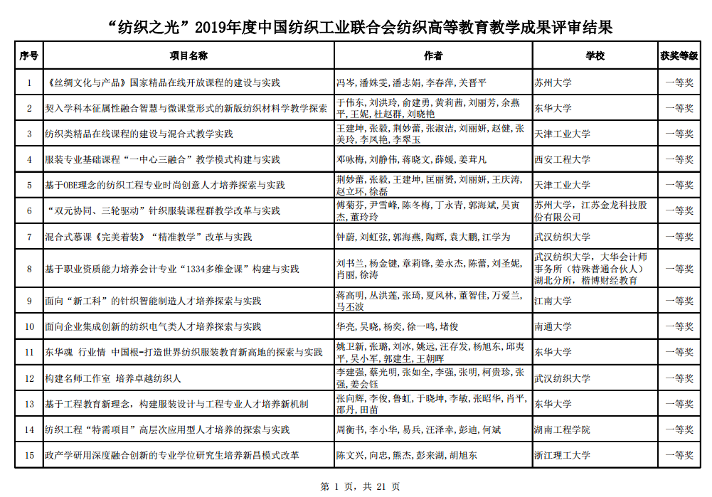 中国纺织服装教育学会在日前公布的“纺织之光”2019年度中国纺织工业联合会纺织高等教育教学成果奖的决定中,我院周衡书教授牵头申报的纺织工程“特需项目”高层次应用型人才培养的探索与实践、左双喜老师牵头申报的基于“多元融合”理念的服装与服饰设计专业课程体系改革与实践项目分别获得一等奖、三等奖,今年的一等奖共26项,学院级院校总共只获得3项,其余全为大学级学校获得,这是自2013年以来时隔6年我院第二次获得此类大奖。中国纺织工业联合会纺织高等教育教学成果奖每二年开展一次,属于省级成果奖。