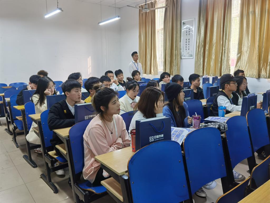 会上,主讲人用PPT向同学们展示并详细介绍了企业规章制度、福利待遇、成人网站、现有产业结构、人力资源等方面。随后,17级纺织工程专业毕业生曹钦同学分享了他加入巨丰布业的学习成长经历与对公司的认识,并简单介绍了公司情况,并真诚地邀请同学们能够加入巨丰这个大家庭。