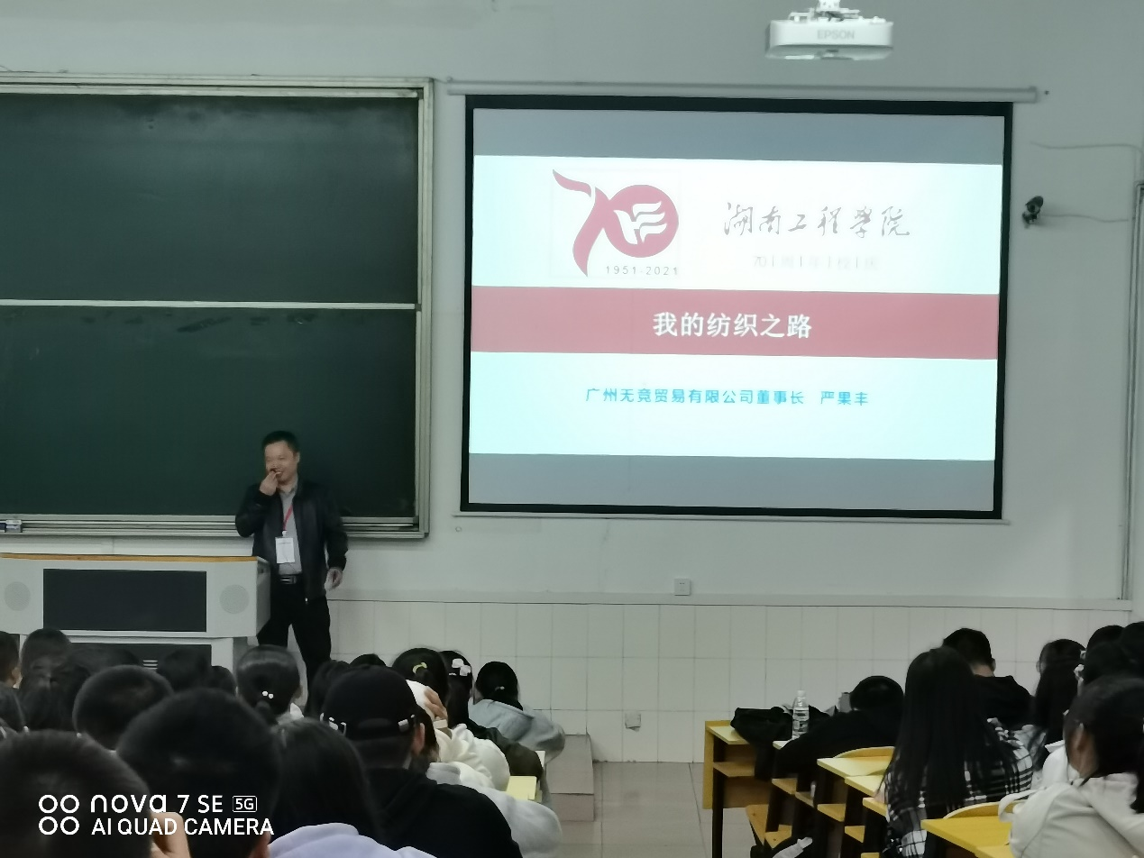 广州无竞贸易有限公司董事长严果丰校友给大家做了题为“纺织就业发展及心路历程” 的主题分享。严学长是棉纺工程94211班的毕业生,也是多家纺织品及电子商务企业创始人。他践行湖工校训“锲而不舍,敢为人先”精神,20年来一直钻研专业技术,并抓住电商行业蓬勃发展的契机,利用自己的技术,开发了淘宝爆款商品“名字贴”,成为该领域的第一人。他用自身工作和人生发展历程,殷切告诫同学们要有钻研精神,要“追求完美,但不苛求完美”,要“比别人多观察一点点,多思考一点点,多做一点点”。