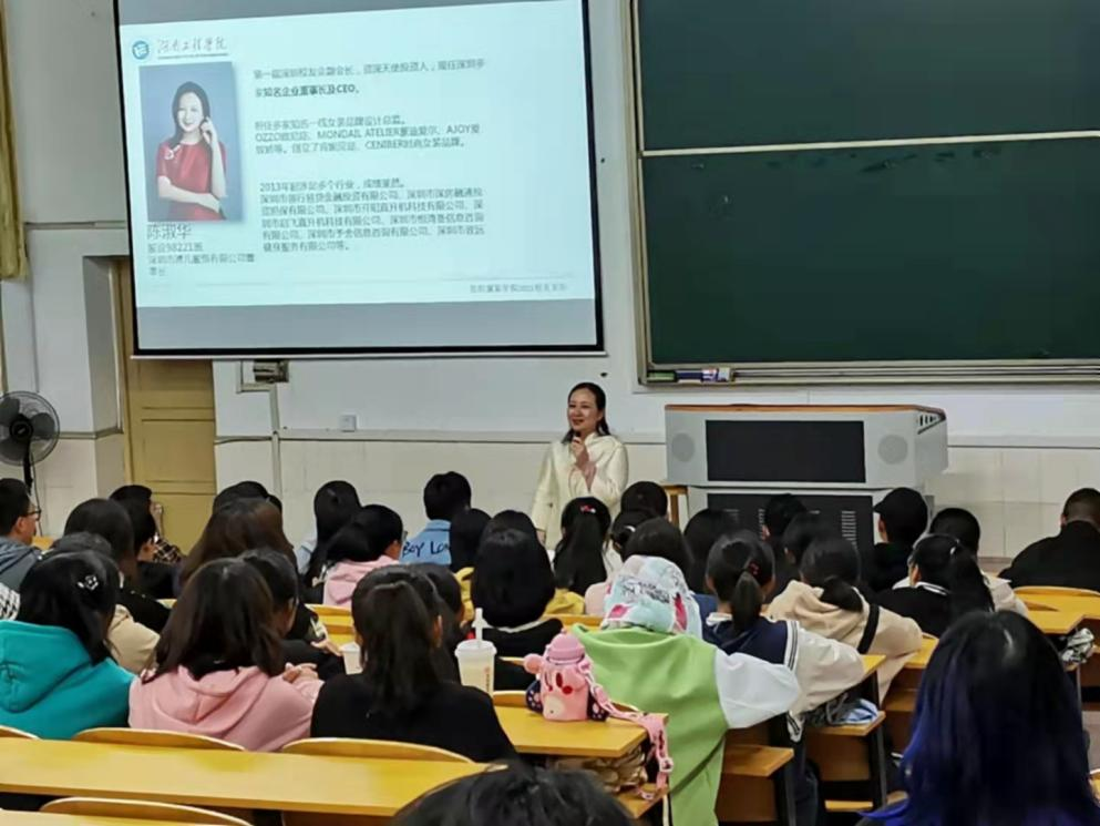 陈淑华,第一届深圳校友副会长,资深天使投资人,现任深圳多家知名企业董事长及CEO。她就新生大学四年规划和就业方向方面做出了明确指导,“得到一个人的认可,社会的认可,是要看一个人自身的能力和努力”她用自己跌宕起伏的人生经历告诉同学们大学四年要调整好自己的心态,乐观向上,要把精力放在学习上。在就业方向上,她认为销售是最大的就业前景,希望同学们好好学习专业知识,未来努力向服装销售的方向发展。陈淑华学姐精彩的分享让同学们受益匪浅,让大家对自己的未来有了更准确的的把握。