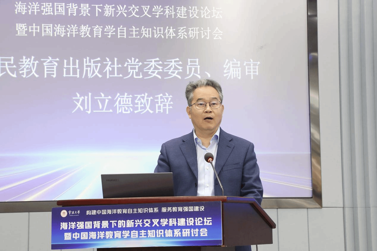人民教育出版社党委委员、编审刘立德致辞。刘立德提到,海洋教育学作为新兴交叉学科在服务高校拔尖创新人才培养上大有可为,海洋教育学教材体系建设是海洋教育学科建设的切入点和突破口。在这次会议上,第一个构建中国海洋教育学自主知识体系的宣言发布,第一本海洋教育专业期刊《海洋教育研究新刊》揭幕首发,第一本海洋教育本科教材《海洋教育学》的研讨工作正式起航,这些将载入中国海洋教育史册,必将对海洋教育学自主知识体系建设产生深远影响。