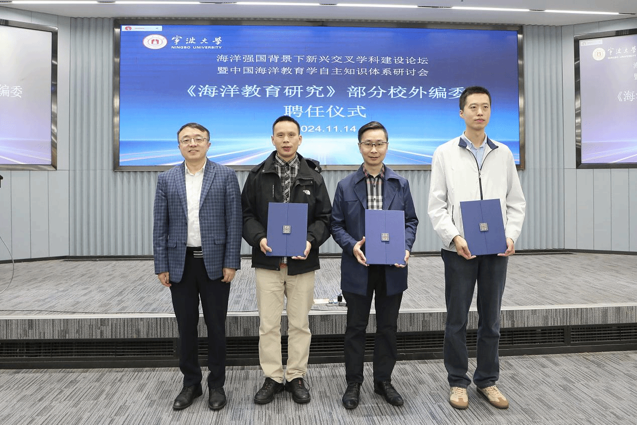 宁波大学督评中心主任、海洋教育研究中心主任、《海洋教育研究》主编刘训华教授为校外编委刘来兵、刘超、刘齐颁发聘书。
