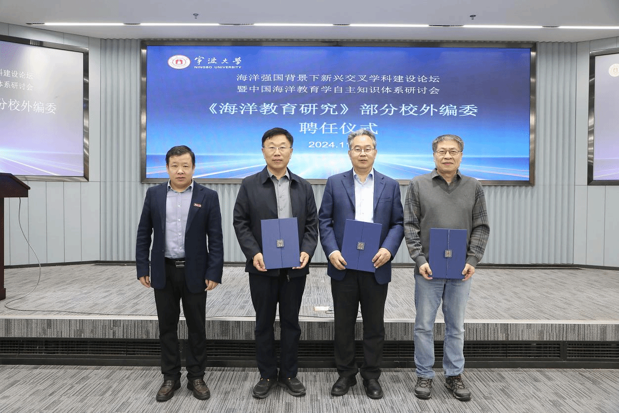 发布会第二阶段,《海洋教育研究》部分校外编委聘任仪式。宁波大学副校长李伟平为刘立德、黄明喜、宁波等三位校外编委颁发聘书;