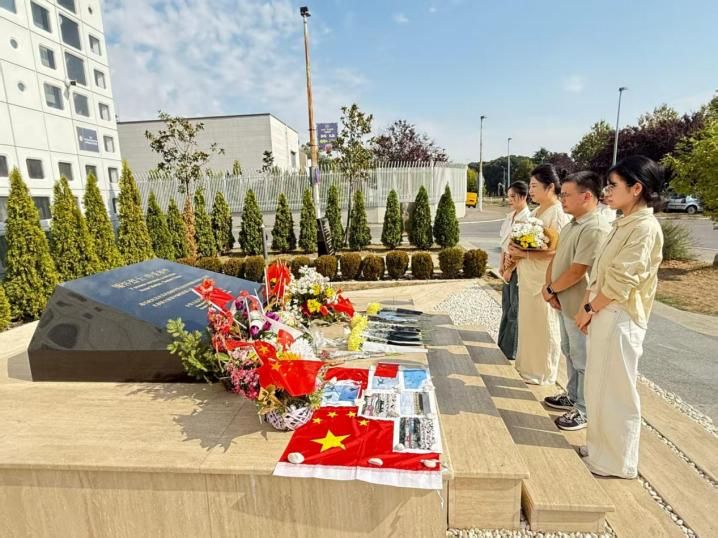 在中国人民抗日战争暨世界反法西斯战争胜利80周年之际,9月8日,宁波大学教师成人网站教师党员余利川副教授与刘鑫副教授带领两位硕士研究生在塞尔维亚贝尔格莱德参加2025欧洲教育研究协会年会(European Conference on Educational Research, ECER)。学术交流期间,四位师生怀着无比崇敬与沉痛的心情,前往中国驻南斯拉夫联盟大使馆旧址,凭吊在1999年5月7日使馆被炸事件中牺牲的邵云环、许杏虎和朱颖三位烈士,以高校教育工作者与青年学子的赤诚,传递跨越时空的缅怀与敬意。