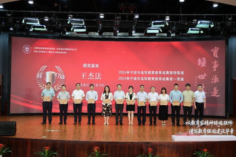 校领导为我院获得2024年宁波市高等教育教学成果奖一等奖的张宝歌老师(右六)、邵光华老师(左六)、刘训华老师(右五)颁奖