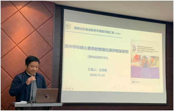 首先,王存宽教授围绕《高中学科核心素养的情境化测评框架研究》的主题做了报告。王老师向大家介绍了高中学科核心素养的情境化测评框架的研究思路。王老师指出,教育评价事关教育发展方向,真实、有效、可靠的评估和测评是改进各级教育实践和提升学生学习能力的关键,是建立高质量教育系统的核心。指向学科核心素养的测评将成为今后测评的方向,明确学生学科核心素养的达成程度将成为教育评价工作最有用的目的。该选题在核心素养的背景下,以化学学科为例展开论证。