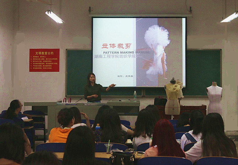 左双喜老师在红楼102为服设1402班的学生上了一堂公开课。本堂课的主要内容为“立体裁剪与形式美法则”。左老师首先就形式美法则的基本概念进行了详细的介绍,并用多媒体图文并茂地介绍了形式美法则在服装中的具体运用与表现。随后以一件“立方体在立裁中的构成表现”为例在人台上进行了立体裁剪操作,从上衣原型、立方体结构,结合省道的分割线设计、分割线的位置与比例等方面都有一个相对具体的讲解和示范,使学生更好地理解形式美法则在立裁中的运用。课堂引用了意大利立体裁剪、企业立体裁剪、日本的设计师中道由子等所使用的立裁方法。此次一个半小时的公开课,将理论结合实际案例讲解,并将立体裁剪与形式美法则进行综合分析,紧密结合生产实际,教学内容完整且有重点,所涉知识面较广,讲解通俗易懂,为学生自主设计打下了基础,听课教师进行了点评,并对此次公开课给予好评。
