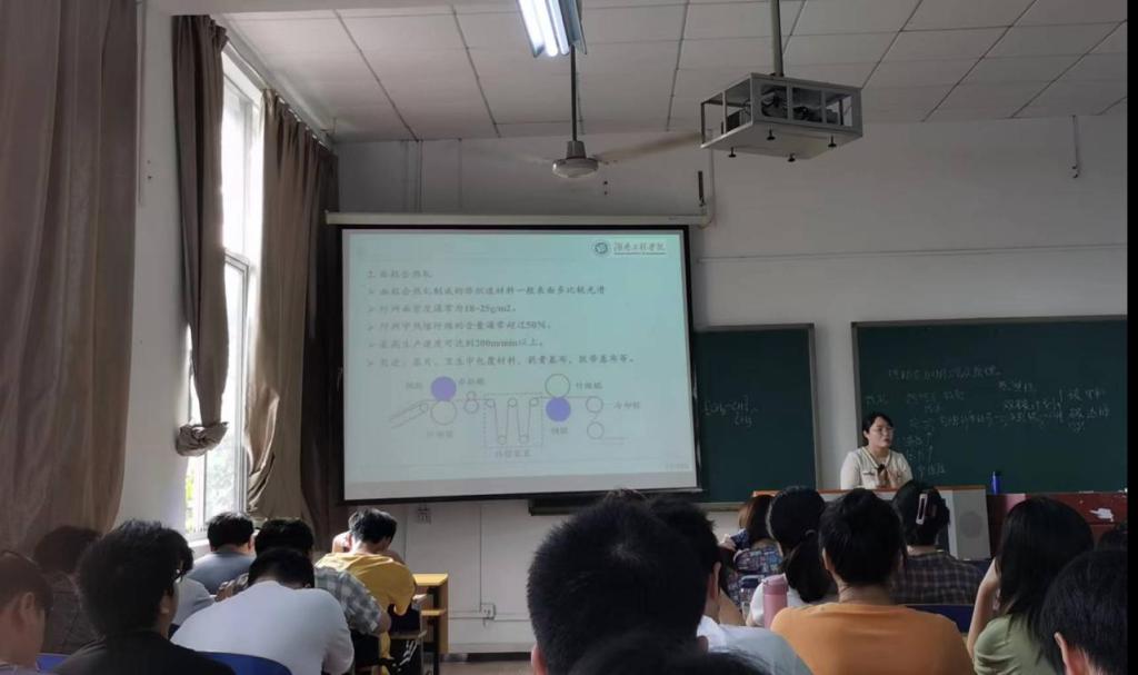 课程以热粘合加固原理与工艺为主线,围绕热轧粘合原理和方式来展开。以热轧粘合中使用具有热塑性的高聚物为纤网原料,通过加热加压的方式,使纤网熔融固化,达到取代传统化学粘合剂的效果,能耗仅为化学粘合的1/3-1/5,降低了产品的能耗。罗凤香老师深入挖掘课程思政元素,将热粘合加固过程中的节能减排方式和清洁生产效果与我国实现“双碳计划”的“碳达峰”和“碳中和”目标相结合,有效将绿色环保的理念根植于学生的心中,鼓励同学们为将来行业的 “清洁绿色”发展方向贡献力量,达到润物无声的育人效果。