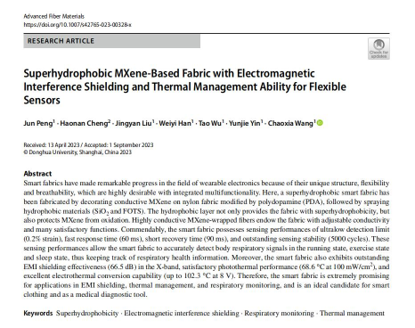 近日,纺织工程教研室主任程浩南与王潮霞教授团队合作,在智能纺织材料领域取得新进展,研究成果以“Superhydrophobic MXene‑basedfabric with electromagnetic interference shielding and thermal management ability for flexible sensors”为题发表在国际期刊《Advanced Fiber Materials》上(JCRQ1,中科院SCI一区TOP期刊,IF=16.100)。程浩南博士为该论文第二作者,成人网站
