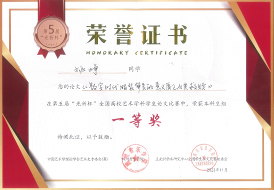 11月20日,第五届“光祈杯”全国高校艺术学科学生论文比赛结果揭晓,我校服装与服饰设计2020级姚峥撰写的论文《数字时代服装审美的意义匮乏及其救赎》脱颖而出,荣获本科生组一等奖,指导老师夏添获评“优秀指导教师”。