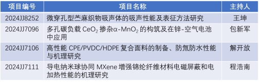2024年3月29日,湖南省科学技术厅公布了2024年度湖南省自然科学基金立项项目名单,纺织工程教研室王坤老师、解开放老师、包新军老师和程浩南老师申报的项目成功获得立项,这是纺织工程教研室在自然科学研究和科技创新方面取得的一次重大突破。