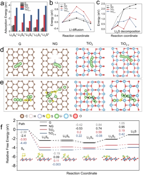 多硫化物(LiPSs)的穿梭效应和缓慢的转化动力学导致锂硫电池(LSBs)的循环性能差和能量效率低。在这项工作中,通过表面活性剂导向的水热生长,在多巴胺保护的热解下合成了一种分层结构的纳米复合材料,作为LSB的双向催化剂。该纳米复合材料由N掺杂的还原氧化石墨烯(rGO)纳米片通过界面N-Ti和C-Ti键固定在均匀分布的TiO2-x纳米颗粒上,从而形成丰富的2D/0D肖特基异质结(rGO/TiO2-x)。密度泛函理论(DFT)计算和原位拉曼表征表明,rGO/TiO2-x有效抑制了LiPSs的穿梭,增强了氧化还原动力学,实现了硫阴极的高利用率,提高了电池的整体可逆性。在高硫负荷和低电解质/硫比下获得高面积容量。在电流密度为0.2C (1C = 1675 mA· g−1)时,初始比容量达到1010 mA h·g−1,在100次循环中,比容量保留率达到86.4 %。