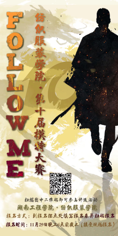 第十届模特大赛——“FOLLOW ME”(追随我的脚步),让学生勇于展现自我,借此寓意,此次模特大赛以缓解辛苦学习带来的紧张疲劳,提高大学生各方面素质为宗旨,培养当代大学生对自我展现的意识,展示平民模特的精神风貌,为全校师生带来一场光和影、形与体的视觉盛宴。