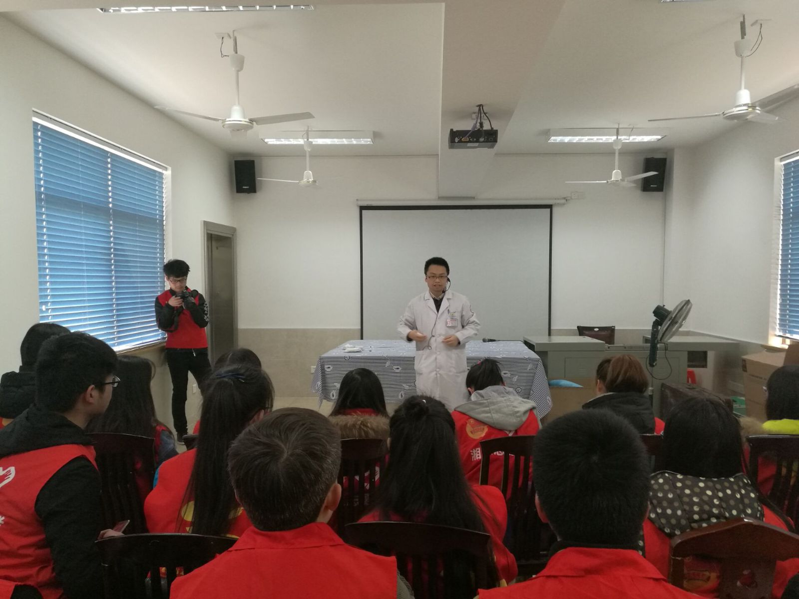 演练培训师湘潭市妇幼保健院举行。演练前,妇幼专家首先强调遇到突发事件要谨记的两个急救原则:如果一个人昏迷,心脏不跳动了,无论有多少骨折、多少外伤,尽量要先对其进行心肺复苏,这是第一个原则;第二个原则是:先自救再互救,在保证自身生命安全的前提下再救治别人。随后,讲解员为学生讲解了心肺复苏、常见急症、创伤、应急处理、突发事故、现场救护等理论知识,并分享了对伤者止血、固定伤口的方法与技巧。