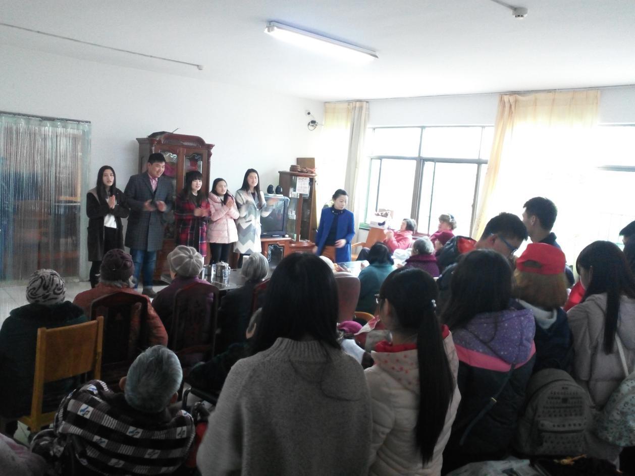 红楼出发,徒步前往福乐康老年公寓。到达敬老院后,志愿者们先向老人们简单地介绍了自己,并为他们送上备好的水果,主动与老人们嘘寒问暖拉家常。在简单地了解后,青年志愿者们为老人们献上了自己准备的节目,经典老歌、即兴表演等一一上演,让老人们情绪高涨、思绪万千。热闹的场景、熟悉的歌曲、温暖的情谊,仿佛将老人们带回了年轻的时代、青春的岁月,甚至暗暗流下了感动的泪水。合唱、独唱、歌舞伴奏,青年志愿者们以丰富多彩的形式为老人们带去快乐、送去温暖。