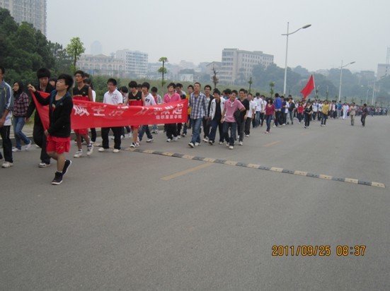 学生党员组织大一新生在学海花园集合完毕,学院学生第一党支部书记、学办主任唐星星宣布活动正式开始,晨跑队伍带着“低碳生活 从我做起”的宣传横幅出发,经新北高速,到达新校区时,不少外院学生为表示对低碳校园生活的支持,也自觉参与到宣传队伍中来。相信这越来越壮观的队伍,证明低碳校园生活理念正得到广泛的认可与践行。
