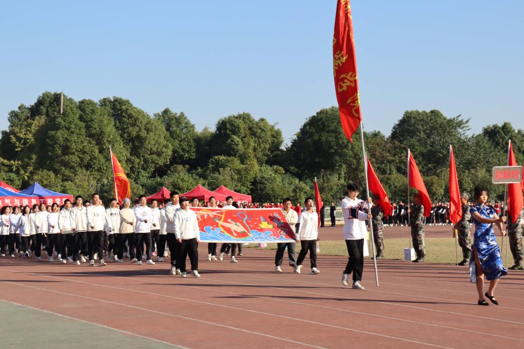 体育馆正式举行。开幕式上,护旗手们高举国旗,五星红旗伴随着国歌升上旗杆,各院方阵一一入场,他们昂首挺胸,英姿飒爽,迸发着青春活力,他们歌声飞扬,舞步轻盈,展现着青春风采。