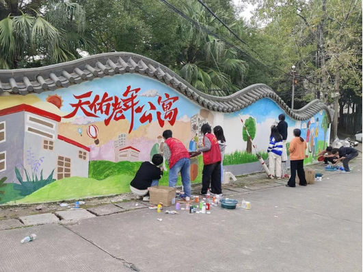 经过充分的讨论,志愿者达成了一致意见,形成了完整的绘墙思路。随后,志愿者们在天佑老年公寓围墙的外立面上进行涂鸦创作,一幅幅美丽的画作充分表达了现代社会对老年人的关爱之情。