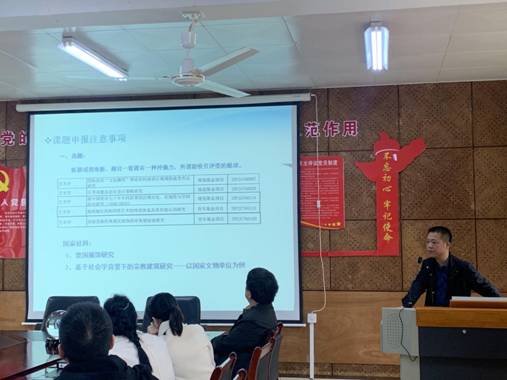 报告伊始,李爱国书记对柴颂华教授的到来表示欢迎。首先,柴颂华教授简要介绍了课题分类和课题类别。随后,从选题、国内外研究现状综述、研究内容、研究方法和技术线路、前期基础、课题人员组成等方面详细讲解了课题申报时应注意的事项。其中,柴颂华教授以5个艺术类的基金项目举例说明了“视角新”、“观点新”在项目选题中的重要性。在研究内容部分,他强调要逐个分段罗列研究的重点、难点、创新点、解决的问题等内容,除观点要新颖具备创新性外还要注意突出重点、详略得当。研究方法则亦要体现专业性,切勿自己随意改编写某种研究方法。最后,柴颂华教授以自己的研究项目为例完整了演示的项目申报书的撰写内容和方法,学院教师们积极参与了交流讨论。