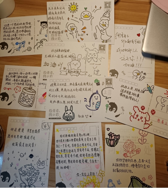 学生联合组织开展“考研送温暖,助力考研学子金榜题名”活动。学生联合组织为考研学子送上写满祝福的小贺卡、以及加油打气视频。