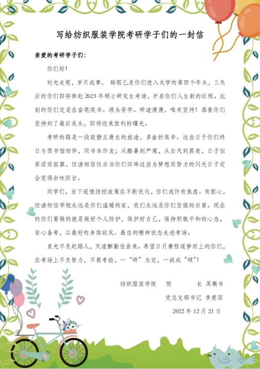 师生通过致信、祝福卡片、加油视频为考研冲刺的学子送去温暖,助力我院学子金榜题名!