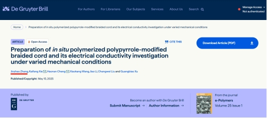 研究生张金召的研究成果《Preparation of in situ polymerized polypyrrole-modified braided cord and its electrical conductivity investigation under varied mechanical conditions》在《e-Polymers》期刊上成功发表,该期刊为中国科学院分区的三区期刊。