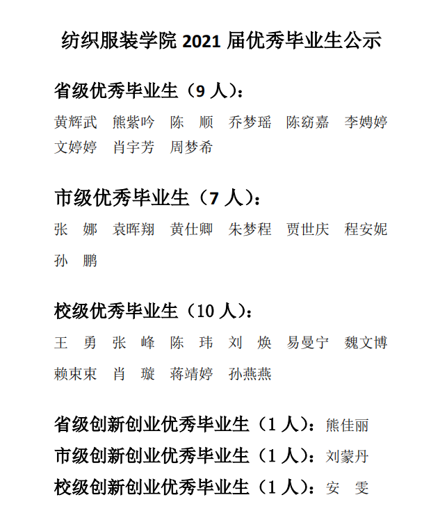 根据学校《关于评选2021届省、市、校级优秀毕业生和创新创业优秀毕业生的通知》的要求和学校优秀毕业生评定办法,经本人申请、班级推荐、班主任审核、学院核查,初步评定了成人网站 2021届优秀毕业生,现将初审名单公示如下: