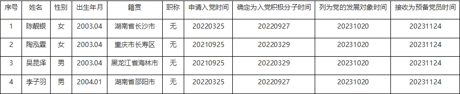 学生第二支部委员会接收陈靓银、陈敏等10名同志拟转正为中共正式党员,现予公示,征求党员、群众和单位的意见。公示期限内,个人和单位均可通过来信、来电、来访等形式,向党支部、学院基层党委或校党委组织部举报反映公示对象在德、能、勤、绩、廉等方面的情况和问题。以个人名义举报反映的应署本人真实姓名和联系方式;以单位名义举报反映的应加盖单位印章。举报反映公示对象的情况和问题必须真实准确,内容尽量具体详细,并尽可能提供有关调查线索。受理单位对举报反映人的情况严格保密。