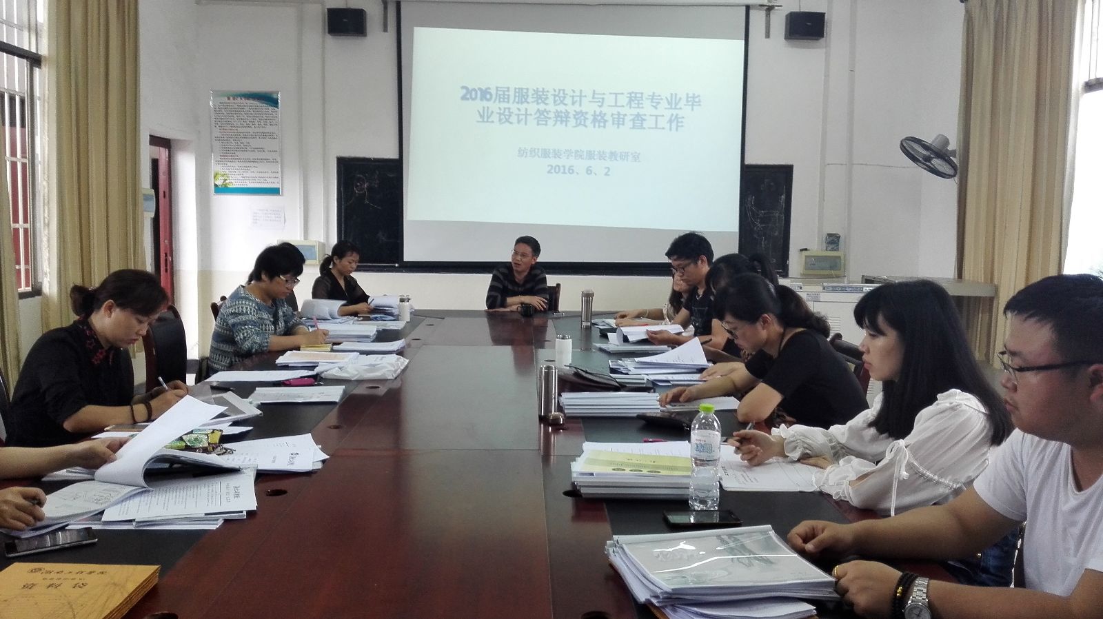 服装教研室于6月2日下午3:00,在北院实验楼503工作室对2016届服装设计与工程专业学生的毕业答辩资格开展了审核工作,参加本次审核工作的有学院领导江灏书记及服装教研室全体老师。本次毕审核是对本届服装专业学生的毕业设计作品资料册进行规范检查,毕业设计资料册的内容有毕业设计主题策划、流行趋势预测、毕业设计款式图效果图、成品展示图、1:5的结构图、放缝图、推档图、排料图、工艺分析说明、品牌调研报告等信息量,全面检验了学生大学四年所掌握的专业知识。老师们采取了相互交叉评阅方式,对每一本资料册进行了认真仔细的审核,从不同方面给予了指导性的修改意见,力争将毕业设计课程各项工作任务落到实处
