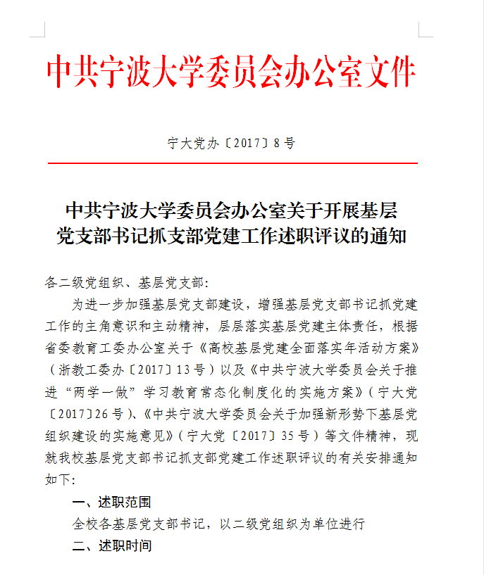 中共宁波大学委员会办公室关于开展基层党支部书记抓支部党建工作述职评议的通知