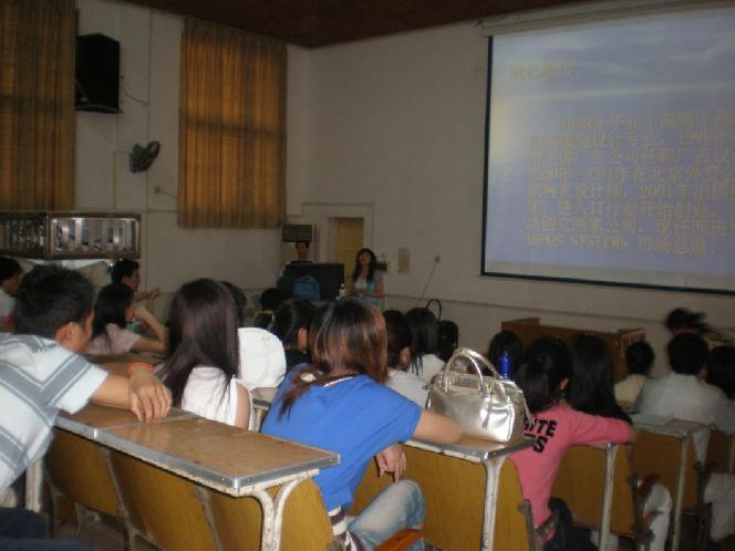 5月8日下午16:30,我院98届优秀校友、现任西班牙AOPOS SYSTEMS市场总监的廖慧玲女士在电教105开展了一场题为“中式元素与欧美主流文化中现代理念的差异”的讲座。院领导、老师、同学都分享了“一个旅行包装载的十年奋斗”的故事,无不被廖女士的自信、美丽所深深打动。“我愿意与大家分享我的创业,我的爱情,分享我美丽的蜕变之旅。”掌声一度如雷鸣。这是一个怎样地自信、美丽的女士啊,她向我们讲述了她的成长经历和创业过程,给我们提出了宝贵的建议。她认为作为一个大学生,在努力掌握科学文化知识的同时,也应让自己走向社会,去尝试工作的压力,让自己的经历、创作带上现实色彩。她给我们展示了许多她珍贵的照片,有法兰西的建筑风情、西班牙的人文风情。“我喜欢带着相机去旅游,这样我能记载下许多生命的片刻。”喜欢看服饰风格,喜欢橱窗设计,喜欢各具特色的建筑,这些都将作为很好的设计题材。