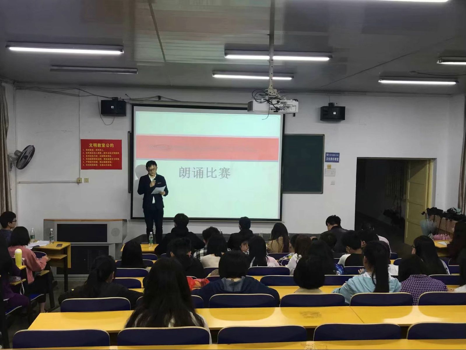 活动期间,同学们按照抽签顺序依次上台朗诵所选文章。他们举止大方、精神饱满,朗诵富有深情,较好的展现了当代大学生的青春风采。选手们围绕“青春”、“父与子”、“我愿是激流”等名篇深情朗诵与表演,不断把活动现场氛围推向高潮。同时,根据选手们的朗诵情况,评委老师依次进行了点评。黄自力希望同学们借此机会相互学习、相互交流,不断提高,共同营造良好的读书氛围。