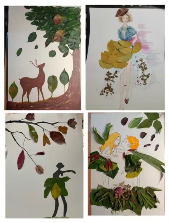 “风吹一片叶”树叶拼贴画活动中,参与同学们通过拾集各式各样,色彩各异的树叶,对树叶进行裁剪、修改、拼贴,最后拼贴成各式各样精美的图案。一幅幅美丽的作品,令人眼前一亮,也表达出同学们内心的情感。一张中国地图表达着对祖国的热爱,一幅山水画描绘出自然的美好,一张秋日美景是对生活的赞美,一张舞者图表达对青春的礼赞。